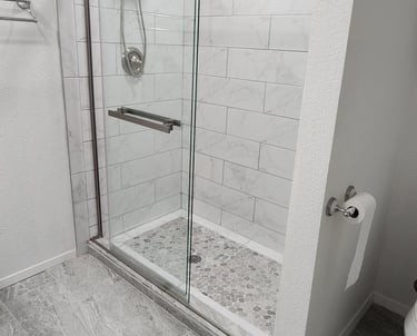 Natural Elements: Beautiful pebble tile flooring for a spa-like feel underfoot.