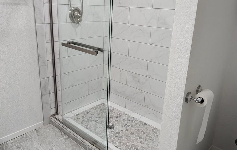 Bright & Airy: Large-format marble-style wall tiles that maximize light and space.